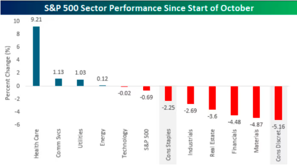Bespoke团队指出,“自10月以来,标普500指数中仅有四个板块录得正回报,其中必需消费品板块跌幅达到了标普500指数大盘的三倍,非必需消费品板块则以5.2%的跌幅,成为这段时间里美股表现最差板块”。(见下图)